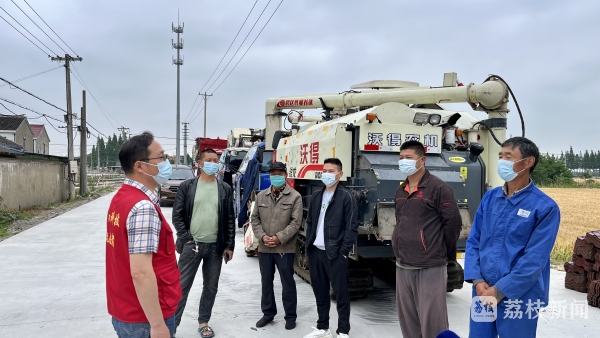 从本月初开始,辛庄镇积极对接跨区农机来常作业,到目前为止共预约了35台收割机,已经到位15台。辛庄镇农村工作局工作人员陆文娟说:“我们通知村里开具接收证明,到高速路口去接,接过来以后,对接的大户根据他的要求就停在大户边上,我们镇里通知他们一到辛庄地界就做48小时以内的核酸检测。”