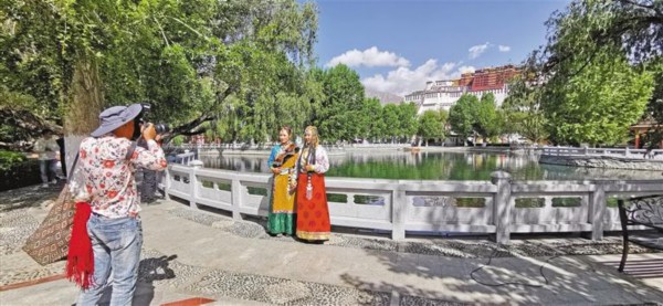 图为近日,游客在拉萨市宗角禄康公园合影留念 。记者 唐斌 摄