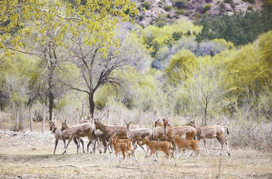 5月13日,在内蒙古大青山国家级自然保护区,小麋鹿跟随麋鹿群活动。 新华社 发 (王正 摄)