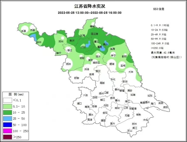 据省气象台统计,25日13时-25日16时,淮北地区出现短时强降水和雷暴大风等强对流天气。徐州、宿迁、连云港等4个市的9个乡镇(街道)的降水量达到25mm以上;前3位分别是徐州经济技术开发区刘集镇小学42.8mm、连云港灌南长茂镇36.7mm、盐城响水33.4mm。
