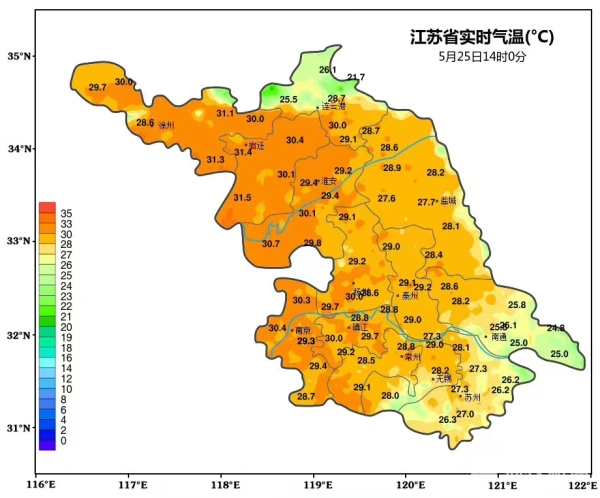 蒋义芳说:“从20日开始,长江以北大部分地区日平均气温已经达到了22℃,达到了气象上的入夏标准。苏南南部以及东南部地区,像南通、苏州、无锡这一带在22℃,是临界附近,江苏西南部地区温度基本上也达到了。”