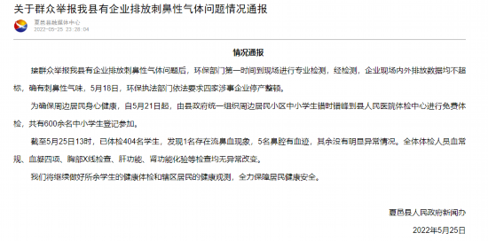 接群众举报我县有企业排放刺鼻性气体问题后,环保部门第一时间到现场进行专业检测,经检测,企业现场内外排放数据均不超标,确有刺鼻性气味,5月18日,环保执法部门依法要求四家涉事企业停产整顿。