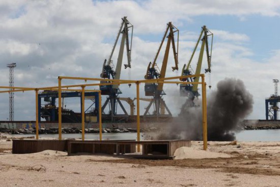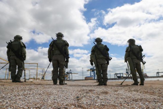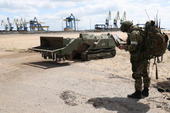 当地时间2022年5月23日,乌克兰马里乌波尔,俄军对马里乌波尔港口进行排雷工作。