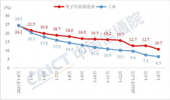 据中国信息通信研究院消息,2022年前4个月,规模以上电子制造业增加值同比增长10.7%,高于工业总体4.2个百分点,是31个制造业大类行业中增长最快的行业。其中,4月份规模以上电子制造业增加值同比增长4.9%,较3月增速回落7.6个百分点,相比规上工业增速大幅回落至-2.9%,电子制造业仍表现出较强增长韧性,为工业增长提供了有力支撑。