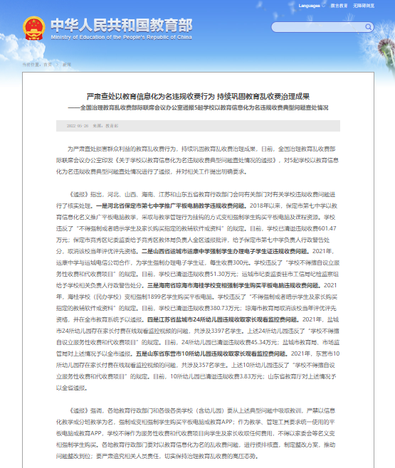 《通报》指出,河北、山西、海南、江苏和山东五省教育行政部门会同有关部门对有关学校违规收费问题进行了核实处理。一是河北省保定市第七中学推广平板电脑教学违规收费问题。2018年以来,保定市第七中学以教育信息化名义推广平板电脑教学,采取与教学管理行为挂钩的方式变相强制学生购买平板电脑及课程资源。学校违反了“不得强制或者暗示学生及家长购买指定的教辅软件或资料”的规定。目前,学校已清退违规收费601.47万元;保定市竞秀区纪委监委给予竞秀区教体局负责人全区通报批评,给予保定市第七中学负责人行政警告处分,取消该校当年评优评先资格。二是山西省运城市运康中学强制学生办理电子学生证违规收费问题。2021年,运康中学与运城电信公司合作,为学生强制办理电子学生证,每生收费300元。学校违反了“学校不得擅自设立服务性收费和代收费项目”的规定。目前,学校已清退违规收费51.30万元;运城市纪委监委驻市工信局纪检监察组给予学校相关负责人行政警告处分。三是海南省琼海市海桂学校变相强制学生购买平板电脑违规收费问题。2021年,海桂学校(民办学校)变相强制1899名学生购买平板电脑。学校违反了“不得强制或者暗示学生及家长购买指定的教辅软件或资料”的规定。目前,学校已清退违规收费380.73万元;琼海市教育局取消该校当年评优评先资格,并在全市教育系统予以通报。四是江苏省盐城市24所幼儿园违规收取家长观看监控费问题。2021年,盐城市24所幼儿园存在家长付费在线观看监控视频的问题,共涉及3397名学生。上述24所幼儿园违反了“学校不得擅自设立服务性收费和代收费项目”的规定。目前,24所幼儿园已清退违规收费45.34万元;盐城市教育局、市场监管局对上述情况予以全市通报。五是山东省东营市10所幼儿园违规收取家长观看监控费问题。2021年,东营市10所幼儿园存在家长付费在线观看监控视频的问题,共涉及357名学生。上述10所幼儿园违反了“学校不得擅自设立服务性收费和代收费项目”的规定。目前,10所幼儿园已清退违规收费3.83万元;山东省教育厅对上述情况予以全省通报。
