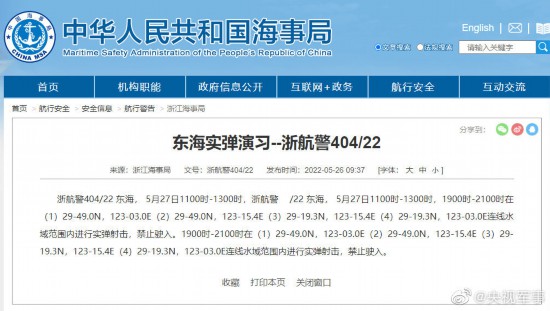 据中国海事局网站消息,浙江海事局发布航行警告,5月27日11时至13时,19时至21时,东海部分海域进行实弹射击,禁止驶入。