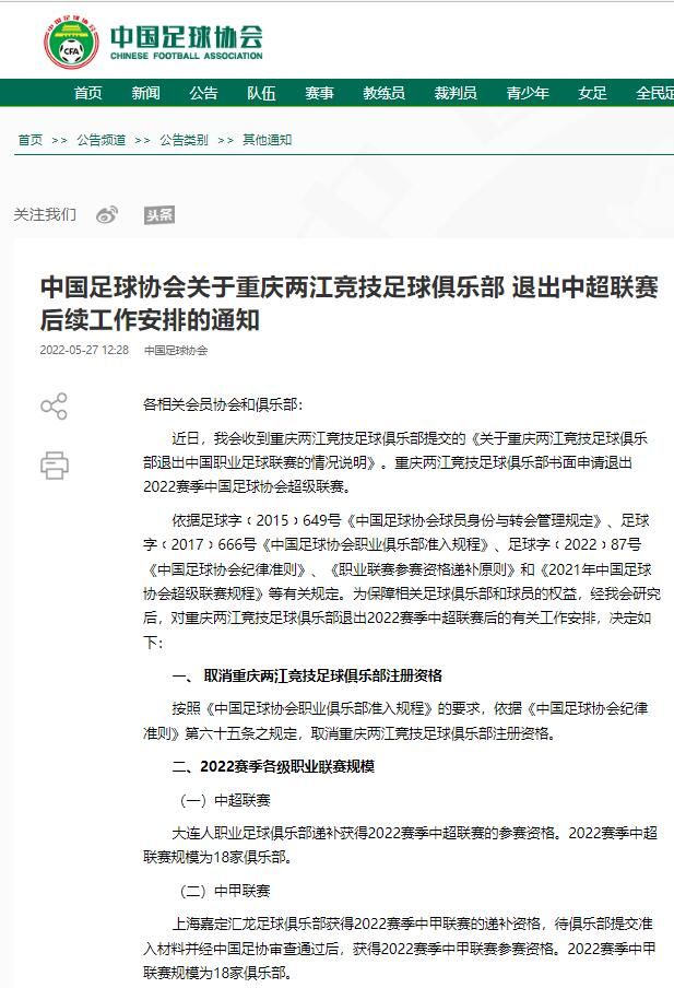 依据足球字﹝2015﹞649号《中国足球协会球员身份与转会管理规定》、足球字﹝2017﹞666号《中国足球协会职业俱乐部准入规程》、足球字﹝2022﹞87号《中国足球协会纪律准则》《职业联赛参赛资格递补原则》和《2021年中国足球协会超级联赛规程》等有关规定。为保障相关足球俱乐部和球员的权益,经我会研究后,对重庆两江竞技足球俱乐部退出2022赛季中超联赛后的有关工作安排,决定如下: