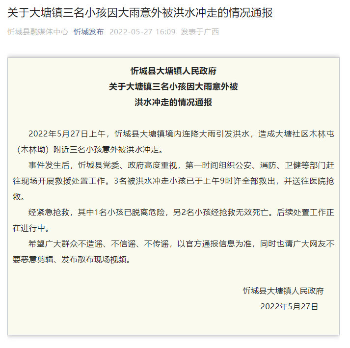 荔枝新闻讯 “忻城发布”微信公众号5月27日消息,广西忻城县大塘镇人民政府发布关于大塘镇三名小孩因大雨意外被洪水冲走的情况通报。