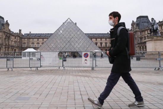 1月19日,一名男子走过法国巴黎卢浮宫的玻璃金字塔。新华社记者高静摄