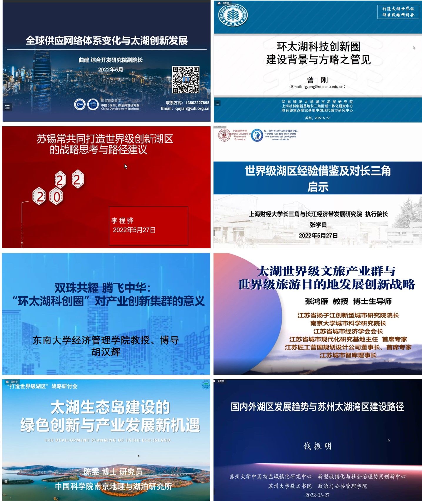 会议主旨演讲阶段,各位专家从不同角度、不同层面、不同领域,为苏州“打造太湖世界级湖区”建言献策。曲建研究员围绕“全球供应网络体系变化与太湖创新发展”,分析太湖世界级创新生态圈的战略定位,并提出苏州打造太湖世界级湖区,要重点关注科技创新模式、科技创新环节、现代产业体系、产业发展园区以及规划发展战略五个方面。曾刚教授以“环太湖科技创新圈建设背景与方略之管见”为主题,基于环太湖科技创新圈建设背景和产业现状,提出苏州打造环太湖科技创新圈要重视环太湖顶层设计,推进跨界产学研一体化,设立政府间科创合作特区。张学良教授以“世界级湖区发展经验借鉴及对长三角启示”为主题,借鉴多个国家的世界级湖区在开发与保护、传承与创新、湖与镇协同开发、完善基础服务、汇集智力资源等五个方面的经验,提出了打造世界级湖区要秉持高水平开放、高质量发展、高品质生活、高效能治理的“四高”发展路径。胡汉辉教授围绕“双珠共耀 腾飞中华:‘环太湖科创圈’对产业创新集群的意义”,提出环太湖科创圈建设的历史使命一方面是整合和重组苏州十大组团创新资源,形成苏州特色、长三角中心区域的创新高原;另一方面通过体现未来和新兴科技的产业创新成果,引领和支撑整个苏州乃至长三角,辐射全国的产业创新集群的发展。张鸿雁教授围绕“太湖世界级文旅产业群与世界级旅游目的地发展战略创新战略”,分析世界级湖区总体发展趋势及时代变迁,结合苏州政策、交通、生态、产业、文旅、文化等优势,提出了十二条创新突破路径。陈雯研究员聚焦“太湖生态岛建设的绿色创新与产业发展新机遇”,以生态文明与生态创新发展方向为切入点,详细介绍太湖生态岛的功能定位,全面阐述了提升生态环境、建设生态村镇、发展生态经济的三大湖区发展策略。李程骅教授聚焦“苏锡常共同打造世界级创新湖区的战略思考与路径建议”,从长三角一体化的视角强调建立共建机制跨区域协同发展的重要性。他指出,苏州要瞄准国际一流创新型城市的建设目标,在打造世界级科创湖区中发挥引领示范作用,绘出“大湖大城”的新场景。钱振明教授以“国内外湖区发展趋势与苏州太湖湾区建设路径”为主题,从世界形势、中国大势、周边声势、苏州优势、未来趋势、可行态势六个方面强调将苏州太湖打造成为世界级湖区的必要性,并提出苏州太湖发展要重视整体规划和产业定位、资源共享和错位发展、市级推动和协同开发、主动承接和融入上海、人才集聚和模式创新、国资引导和社会合作。