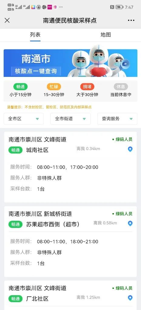 从5月17日起,崇川区与市市域社会治理现代化指挥中心、市大数据管理局、市大数据发展集团合作,推出“南通市常态化便民核酸采样点”服务查询系统,实时展示采样点“热力图”,点位位置、排队情况、服务时间、采样台数等信息一目了然。市民可通过该系统查询附近的核酸采样点,了解实时人流量,按需选择距离最近或等待时间最少的采样点,实现智慧采样、高效采样。