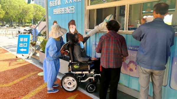 25日上午,记者在南通体展中心有氧绿地核酸采样点采样时,发现维持排队秩序的工作人员主动帮助行动不便的老人“插队”。“天气炎热,老人家来做核酸不容易,大伙们稍等一下,可以吗?”工作人员一边耐心向排队市民解释情况,一边推着坐在轮椅上的老人来到采样窗口。已排到窗口的市民退开几步路,为老人让出足够的空间;采样人员探出大半截身子,专注轻柔地为老人进行采样。“对于积极参加核酸检测的老人,我们开通了‘绿色通道’。”工作人员说。