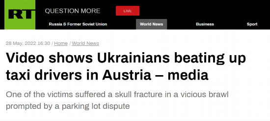 “据媒体报道,有视频显示,一群乌克兰人在奥地利殴打出租车司机”——“今日俄罗斯”(RT)28日以此为题的报道说,其消息源是奥地利媒体“Heute”。