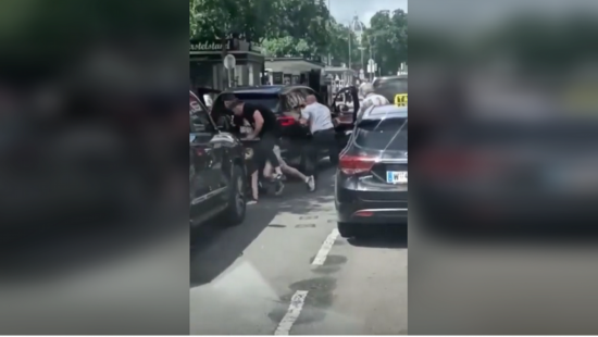 报道称,现场视频显示,双方在一辆黑色SUV旁边激烈冲突,结果其中一名出租车司机被打得不省人事,SUV上的一名男子还拉着受害者的腿,把其拽到离SUV远一些的地方,然后迅速上车离开。