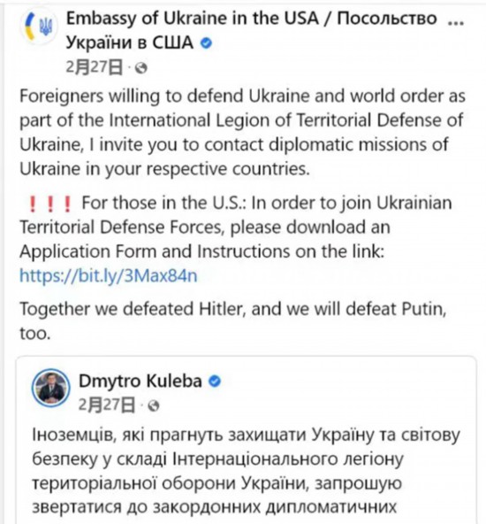 图为乌克兰驻美大使馆发布雇佣军招募信息的推特截图。