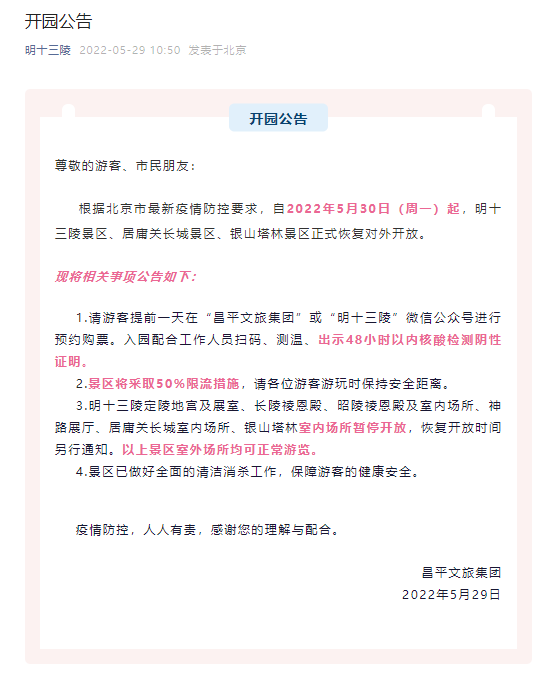 荔枝新闻讯 5月29日,“明十三陵”微信公众号发布公告,根据北京市最新疫情防控要求,自2022年5月30日(周一)起,明十三陵景区、居庸关长城景区、银山塔林景区正式恢复对外开放。