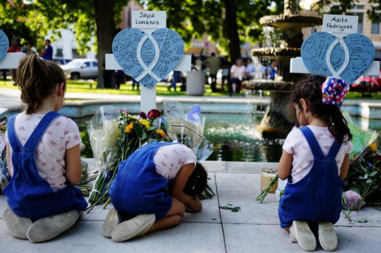 5月27日,在美国得克萨斯州南部尤瓦尔迪市的城市广场,市民哀悼枪击事件遇害者。新华社记者吴晓凌摄
