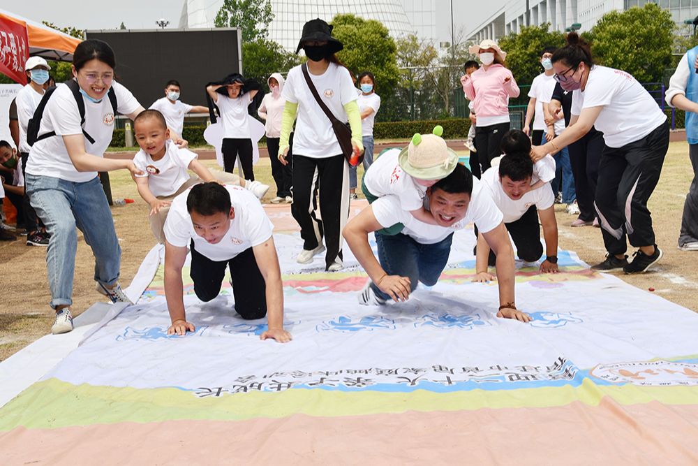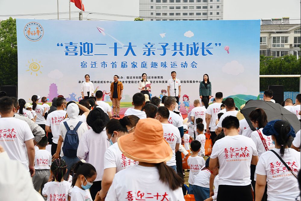 “加油、加油!”5月28日上午,在宿迁市文体馆户外运动场,呐喊声、欢笑声此起彼伏,120户家庭的300多名大朋友、小朋友身着统一的亲子装,正在参加由市妇联、市体育局联合举办的宿迁市首届家庭趣味运动会。