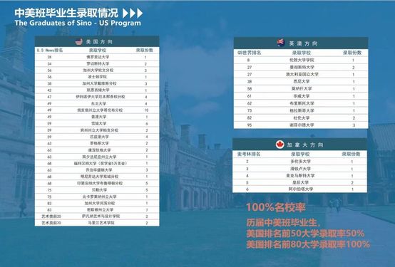南京十三中中美班是南京市第十三中学与美国马萨诸塞州五月花学院签订合作办学协议的中美国际课程班项目。2020-2022年三届中美班学生,100%录取TOP80以及50%录取TOP50美国大学本科,还有部分学生获得英、澳、加等国家大学的录取通知书,成绩斐然。