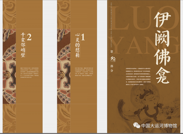 在展厅三部分的空间设计里,展览设计团队参考盛唐时期的壁画和文献资料,部分恢复出同时期宫殿、居住空间的建筑结构与内部装饰,龙门石窟的几座著名窟龛也在展厅中进行了复原呈现;展览组还与相关团队合作,制作了洛阳宫城的建模动画,以大画幅投影的手段进行展示,同时结合序厅的多层宫殿景深装置,“三位一体”地营造了大气恢弘、繁华绮丽又宝相庄严的盛唐时期洛阳城的空间。武则天亲书于升仙太子碑上的飘逸字迹,铭刻了白居易虔诚祷告的石经幢,绚烂夺目的唐三彩,充满异域风情的胡人器具和至今依然矗立在伊洛河畔的龙门石窟,无一不折射出辉煌时代文化与艺术的璀璨光芒。