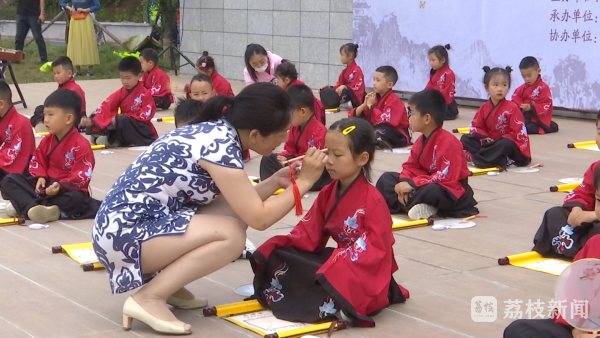 点朱砂、写人字、齐诵经典,记者在南京江北新区龙山社区看到,30多名身着汉服的孩子正在参加一场国学开笔礼,每个孩子还领到了芹菜和香葱。