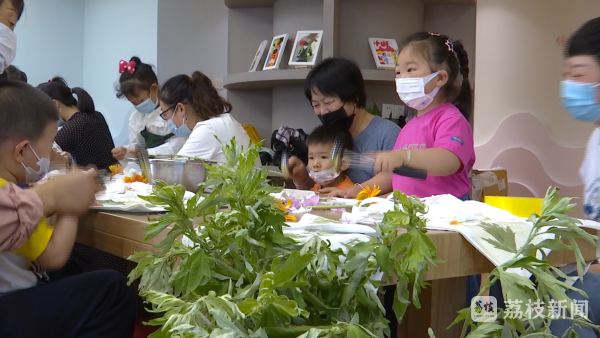 在龙山社区新时代文明实践站,按照儿童友好型社区的要求,设置了手工艺坊、亲子阅读室、妇儿之家、道德讲堂、综合减灾宣教馆等多功能活动室,并设置了全年计划,每个月定期开展丰富的儿童活动课程。在手工艺坊,孩子和家长们正在学习制作植物拓印帆布包。