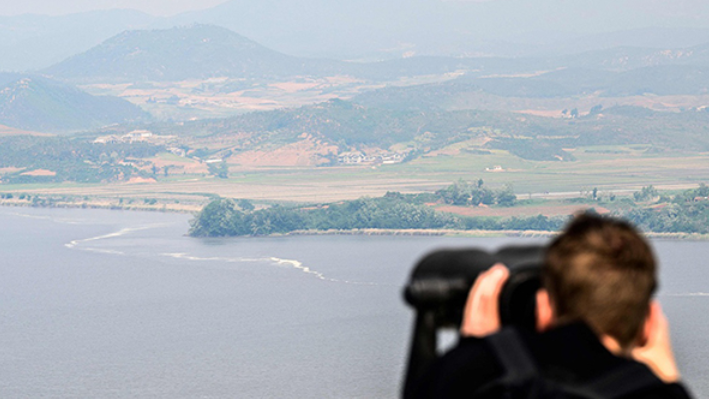 当地时间2022年5月20日,韩国坡州,民众在朝韩边境地区用望远镜观看朝鲜。人民视觉 资料图