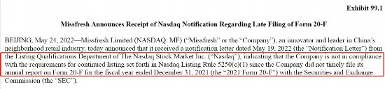 2022年5月24日,每日优鲜公告称,由于公司未及时向美国SEC提交2021年年度报告,收到纳斯达克上市资格部发出的“通知函”,表明每日优鲜不符合纳斯达克上市规则规定的继续上市要求。