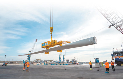 目前,中国明阳智慧能源集团股份公司(明阳智能)的海上风电设备正在意大利南部重要海港塔兰托港口安装。图为2022年1月27日,在意大利南部海港塔兰托,中国和意大利施工人员吊装风电叶片。
