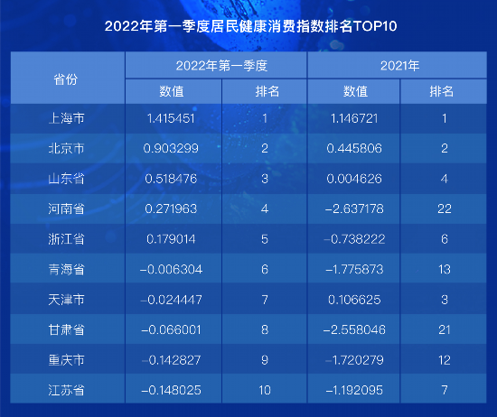 排名方面,上海市居民健康消费指数在31个省(区、市)中继续排名首位(与2021年度相同),排在第二至第十位的依次是北京、山东、河南、浙江、青海、天津、甘肃、重庆和江苏。其中,河南、青海、甘肃和重庆在今年一季度首次进入居民健康消费指数排行前十。河南省居民健康消费指数排名上升最快,从去年的第二十二位上升至第四位。