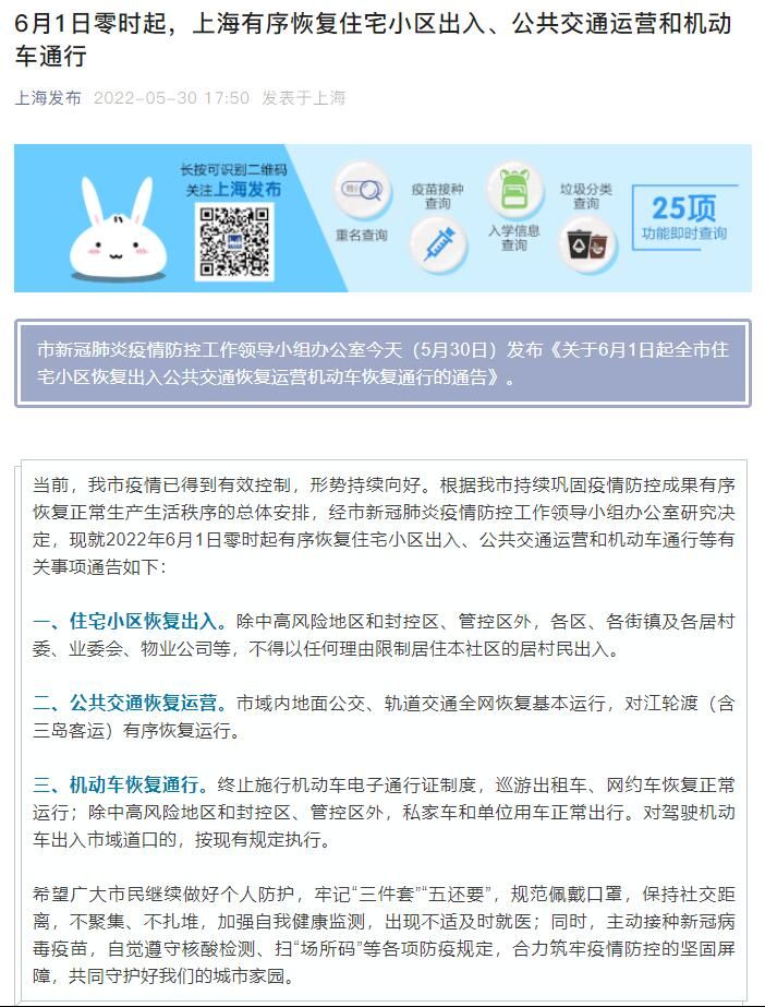 当前,上海市疫情已得到有效控制,形势持续向好。根据我市持续巩固疫情防控成果有序恢复正常生产生活秩序的总体安排,经市新冠肺炎疫情防控工作领导小组办公室研究决定,现就2022年6月1日零时起有序恢复住宅小区出入、公共交通运营和机动车通行等有关事项通告如下: