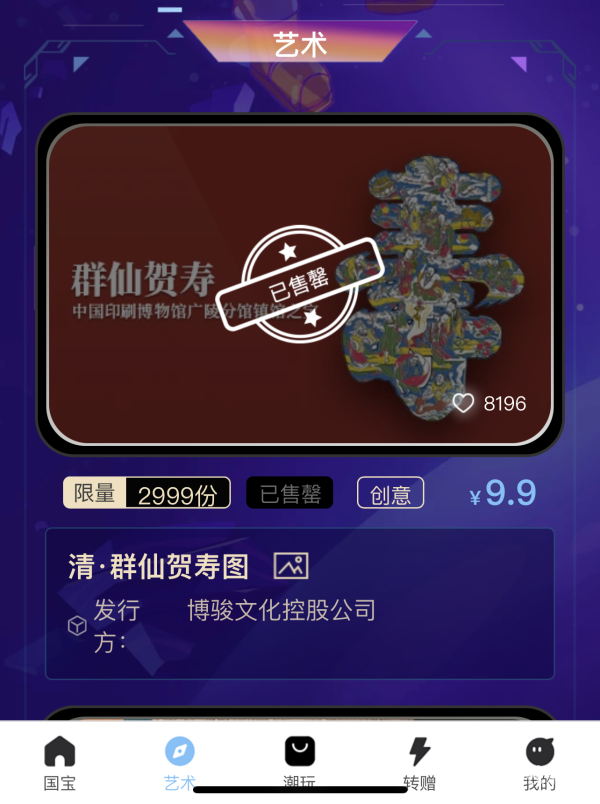 截至当日上午11时,后台数据显示:此次发售数字藏品共计2999份、售价9.9元/份,而围观网民达69076人、抢购者为32361人,抢购率为1:108,上线即全部售罄。其中,海内外青年人是《群仙贺寿图》数字藏品消费的主力军。