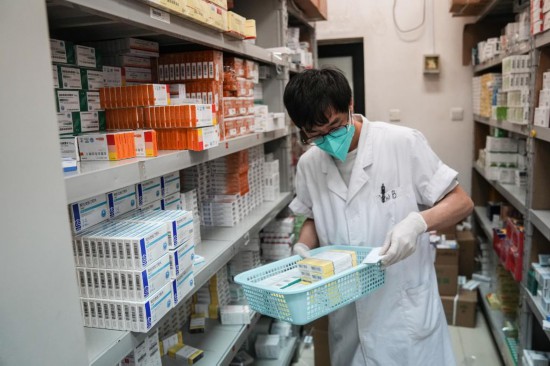 5月22日,在北京市丰台区卢沟桥社区卫生服务中心,工作人员在为患者配药。(新华社记者彭子洋 摄)