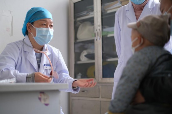 4月25日,青海省妇女儿童医院医生、青南支医队员孙敬(左一)在青海省玉树藏族自治州人民医院儿科门诊坐诊。(新华社记者韩方方 摄)