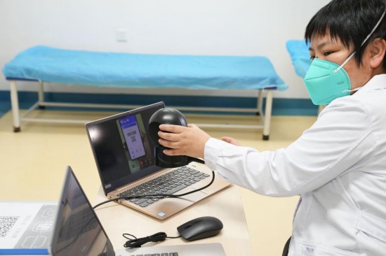 5月22日,在北京市丰台区卢沟桥社区卫生服务中心,医务工作者通过视频连线的方式为预约上门治疗的患者扫描电子医保卡。(新华社记者鞠焕宗 摄)