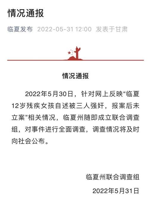 荔枝新闻讯 据“临夏发布”微信公众号通报,2022年5月30日,针对网上反映“临夏12岁残疾女孩自述被三人强奸,报案后未立案”相关情况,临夏州随即成立联合调查组,对事件进行全面调查,调查情况将及时向社会公布。