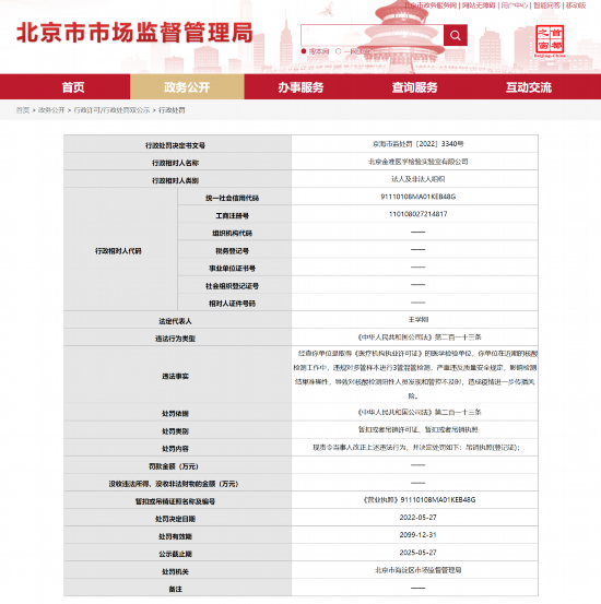 荔枝新闻讯 据北京市市场监管局消息,北京金准医学检验实验室有限公司在近期的核酸检测工作中,违规对多管样本进行3管混管检测,严重违反质量安全规定,影响检测结果准确性,导致对核酸检测阳性人员发现和管控不及时,造成疫情进一步传播风险,被海淀区市场监管总局吊销执照。