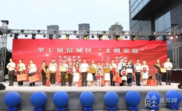 在颁奖环节,幸福街道党工委书记王加贵,党工委副书记、办事处主任高先利为荣获幸福街道2021年度文明家庭颁奖;市委宣传部副部长、市文明办主任陈夫生,区委常委、宣传部部长陈飞为第七届宿城区“文明家庭”颁奖。