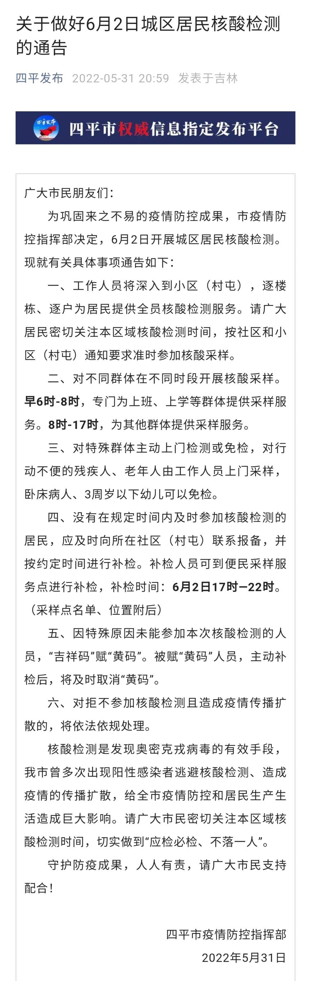 31日晚,吉林四平市委宣传部微信公众号“四平发布”发布《关于做好6月2日城区居民核酸检测的通告》,其中提到: