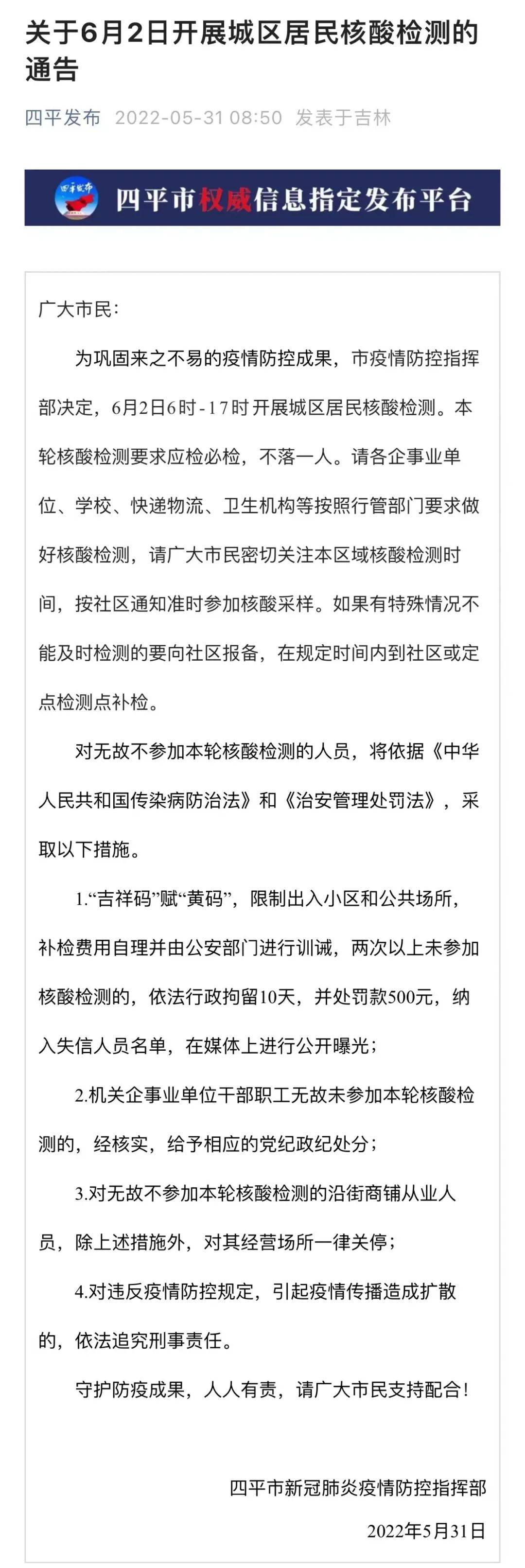 此前,31日早,“四平发布”微信公众号也曾发布一条《关于6月2日开展城区居民核酸检测的通告》,其中提到对无故不参加本轮核酸检测的人员将采取以下措施: