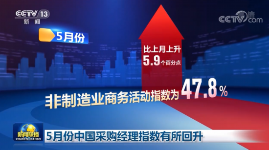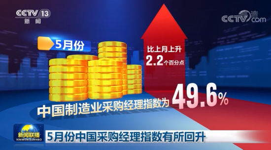 央视网消息(新闻联播):中国物流与采购联合会、国家统计局今天(5月31日)公布,5月份中国制造业采购经理指数为49.6%,比上月上升2.2个百分点,制造业总体景气水平有所改善。
