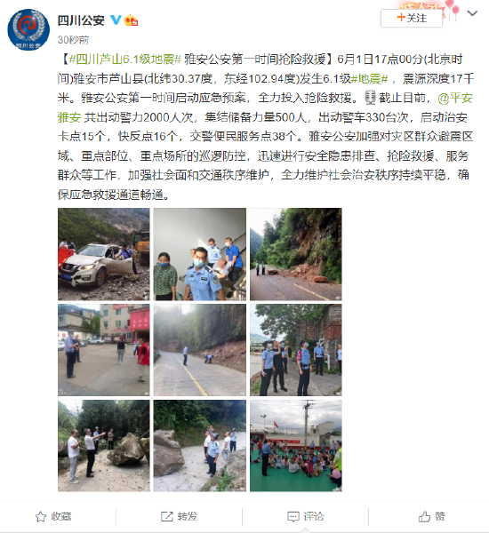 6月1日17点00分(北京时间)雅安市芦山县(北纬30.37度,东经102.94度)发生6.1级#地震# ,震源深度17千米。雅安公安第一时间启动应急预案,全力投入抢险救援。[话筒]截止目前,@平安雅安 共出动警力2000人次,集结储备力量500人,出动警车330台次,启动治安卡点15个,快反点16个,交警便民服务点38个。雅安公安加强对灾区群众避震区域、重点部位、重点场所的巡逻防控,迅速进行安全隐患排查、抢险救援、服务群众等工作,加强社会面和交通秩序维护,全力维护社会治安秩序持续平稳,确保应急救援通道畅通。