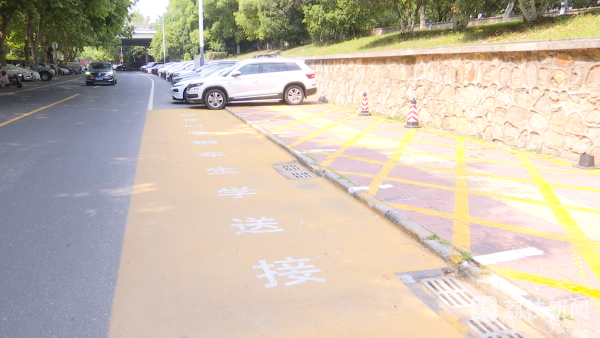 南京市公安局交警五大队五中队中队长宗源介绍:“这个时间段路面黄色区域的停车泊位,是不对社会开放的。芳草园小学门前道路比较窄不易供机动车通行,它周边是龙园东路车流量比较大,但是它有路边停车泊位,所以我们考虑在芳草园小学周边,设置占用停车位的临时接送区来供家长接送孩子们使用。”