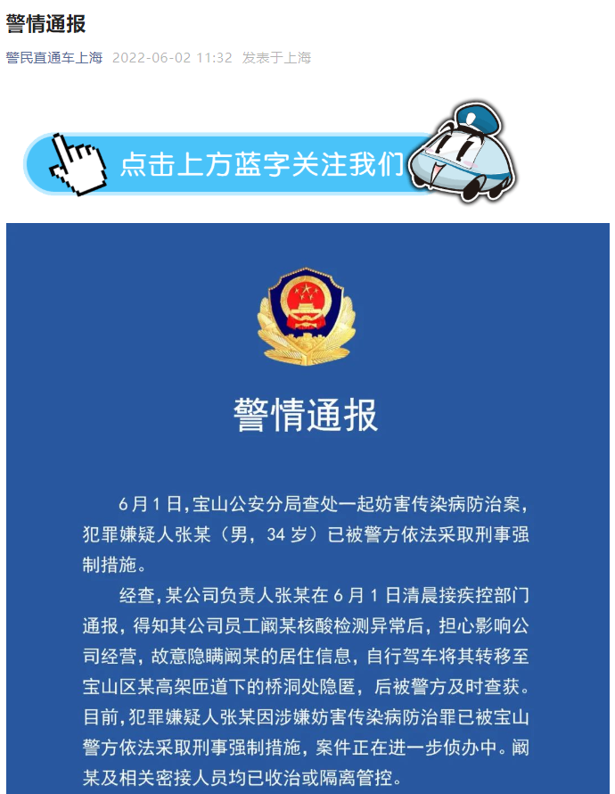 经查,某公司负责人张某在6月1日清晨接疾控部门通报,得知其公司员工阚某核酸检测异常后,担心影响公司经营,故意隐瞒阚某的居住信息,自行驾车将其转移至宝山区某高架匝道下的桥洞处隐匿,后被警方及时查获。目前,犯罪嫌疑人张某因涉嫌妨害传染病防治罪已被宝山警方依法采取刑事强制措施,案件正在进一步侦办中。阚某及相关密接人员均已收治或隔离管控。