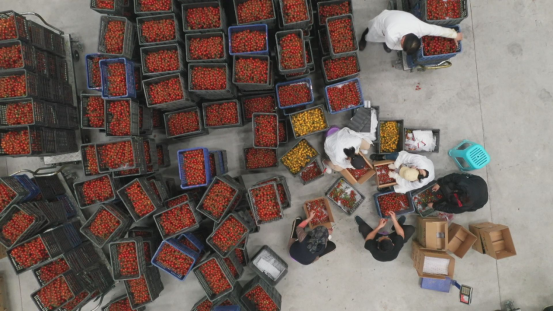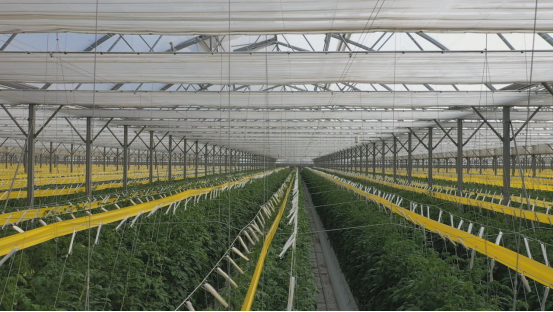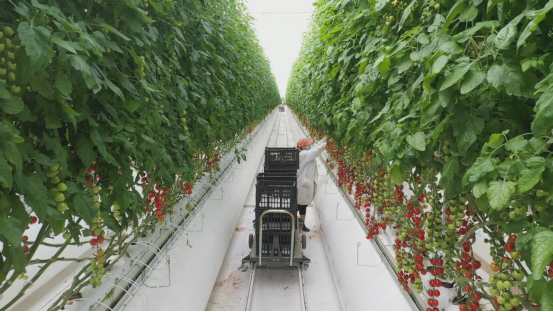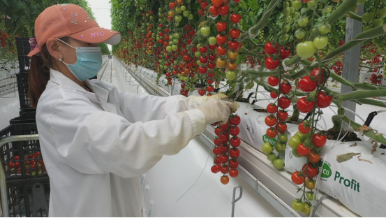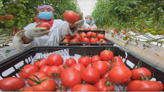 霍尔果斯开建农业发展公司总经理 张小峰:现在我们看到的是我们霍尔果斯现代农业科技产业园,我们一期投资3.5亿元,二期投资1.6亿元,目前种植鲜食类番茄有普罗旺斯、桃太郎、串收红果、串收黄果等八个品种。