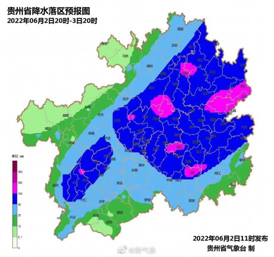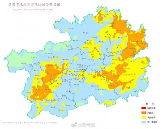 同时贵州省气象台、贵州省自然资源厅联合发布24小时地质灾害气象风险预警预报,预计6月2日20时至3日20时,贵州省六枝特区、普定县、织金县、纳雍县、碧江区、万山区、江口县、玉屏县、印江县、德江县、沿河县、松桃县、兴仁市、普安县、晴隆县、镇远县、岑巩县、台江县、雷山县、麻江县、丹寨县、三都县地质灾害气象风险高(橙色预警);南明区、花溪区、清镇市、水城区、盘州市、红花岗区、播州区、正安县、道真县、务川县、凤冈县、湄潭县、镇宁县、关岭县、石阡县、思南县、凯里市、施秉县、三穗县、天柱县、锦屏县、剑河县、黎平县、榕江县、都匀市、贵定县、瓮安县、龙里县地质灾害气象风险较高(黄色预警);云岩区、乌当区、白云区、观山湖区、开阳县、息烽县、修文县、钟山区、汇川区、桐梓县、绥阳县、余庆县、习水县、赤水市、仁怀市、西秀区、紫云县、七星关区、大方县、黔西市、金沙县、威宁县、兴义市、贞丰县、望谟县、册亨县、安龙县、黄平县、从江县、福泉市、荔波县、独山县、平塘县、罗甸县、长顺县、惠水县地质灾害气象有一定风险(蓝色预警)。