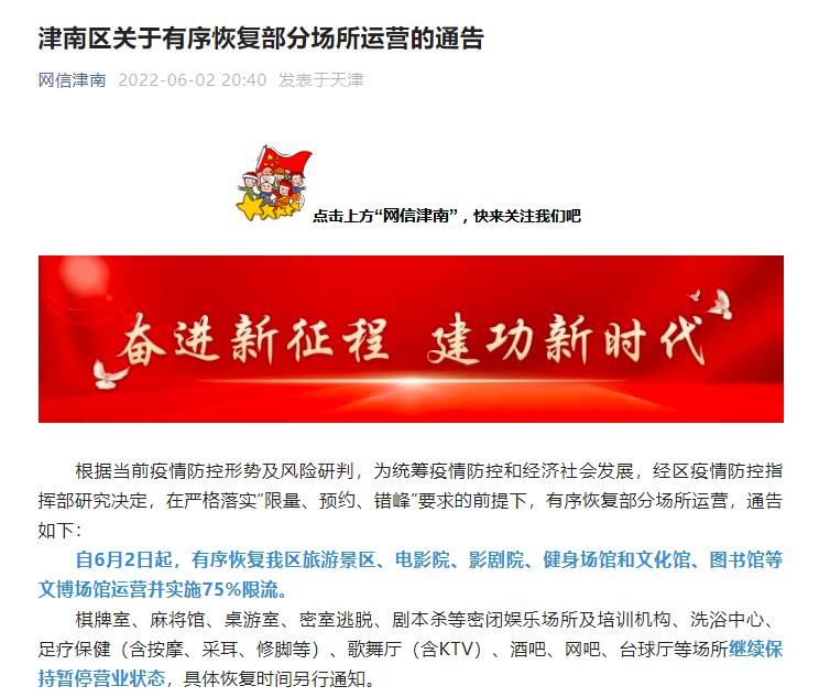 自6月2日起,有序恢复津南区旅游景区、电影院、影剧院、健身场馆和文化馆、图书馆等文博场馆运营并实施75%限流。