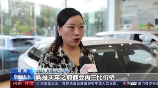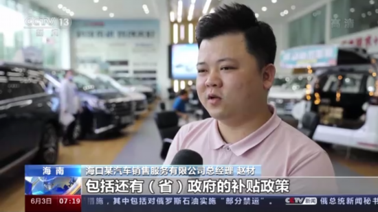 海口某汽车销售服务有限公司总经理 赵材:跟随国家的补贴政策,包括还有(省)政府的补贴政策,我们也实行了一些购车优惠的政策,就为了让消费者能享受到更加实惠的购车优惠政策。