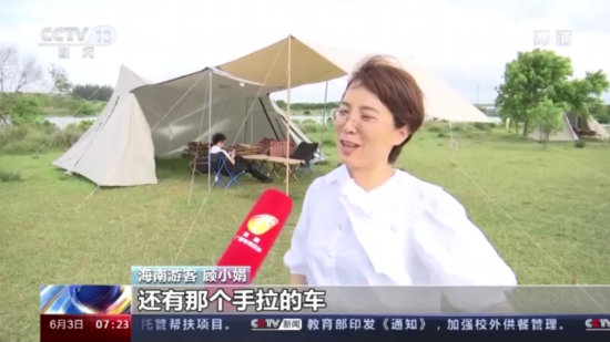 海南游客 顾小娟:就是前几天我们刚刚也是买了那个露营的桌子啊,还有那个手拉的车,所以我觉得是一个很好的亲子的时光吧。