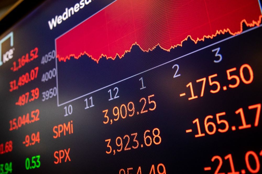 5月18日,在美国纽约证券交易所,电子屏显示交易信息。纽约股市三大股指18日大幅下跌超3.5%。新华社发(郭克摄)